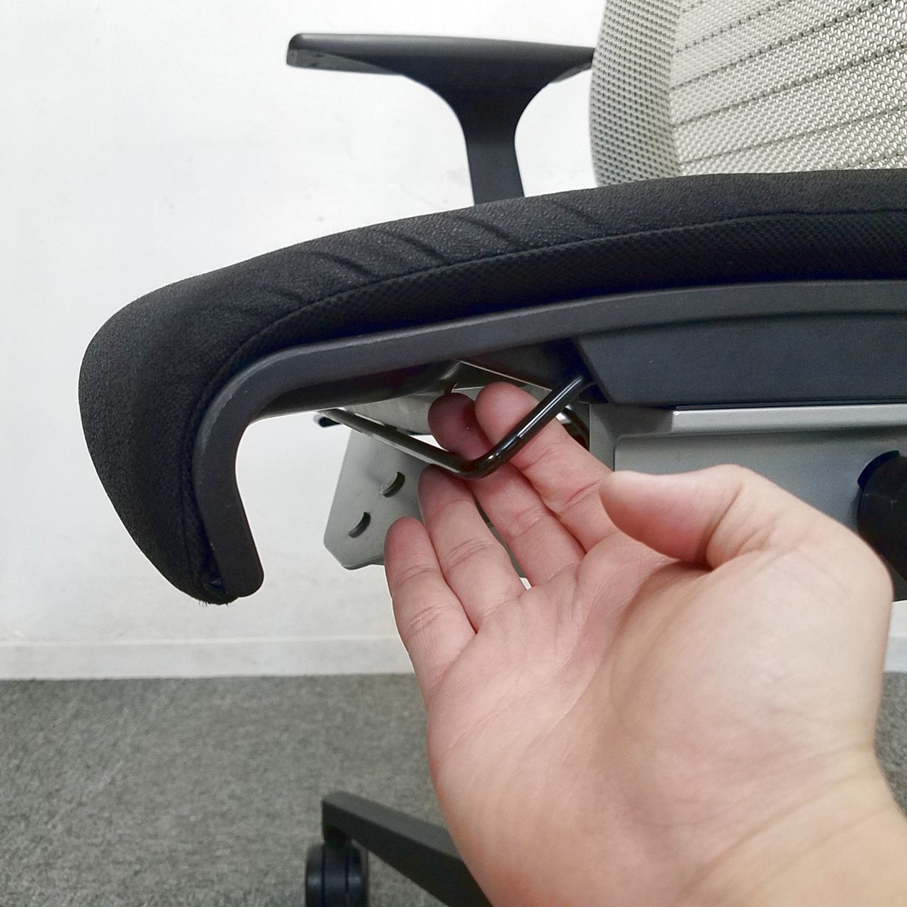 - レバーを引き上げながら座面を前後にスライドさせ、レバーを放すとロックします。背もたれに身体をつけた状態で膝の裏側と座面のエッジの間に5-8センチほどの隙間ができるのが理想的です。