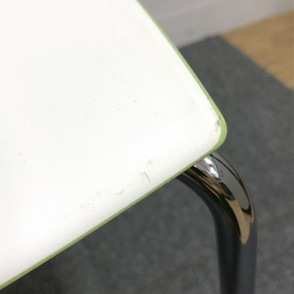 - かなり強い濃い黄ばみ・変色が商品全体にある。(例、座面・背もたれ、脚部等にある。)